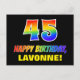 La façade de cette carte postale d'anniversaire amusante, colorée et joyeuse comporte un grand numéro "45" et le message "HAPPY BANTHDAY", tous deux colorés avec un motif inspiré par un gradient de spectre arc-en-ciel, ainsi qu'un nom de destinataire personnalisable jaune gras. L'avant présente également un arrière - plan noir minimal. Le verso de la carte postale contient un message d'anniversaire personnalisé, ou peut-être peut-être effacé et laissé vide si un message doit être écrit à la main à la place. Une carte postale colorée et personnalisable comme celle-ci pourrait être une façon amusante de célébrer le quarante-cinquième anniversaire de quelqu’un. [~Z0000474]