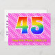 L'avant de cette conception de carte postale thématique d'anniversaire joyeuse, heureuse et amusante comporte un grand nombre "45" ayant un motif inspiré d'un dégradé de spectre d'arc-en-ciel. Il comporte également le message "Joyeux 45e anniversaire" et un nom de destinataire personnalisable. L'avant comporte en outre un motif rayé rose foncé et rose clair joyeux avec des formes de cœur. Le verso comporte un message de vœux d'anniversaire personnalisé, ou pourrait éventuellement être effacé et laissé vide si un message doit être écrit à la main à la place. Une carte postale d'anniversaire personnalisable comme celle-ci pourrait être une façon amusante d'envoyer un message pour célébrer le quarante-cinquième anniversaire de quelqu'un. Des cartes postales comme celle-ci pourraient également être utilisées pour inviter des invités à