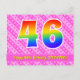 L'avant de cette carte postale de joyeux anniversaire joyeuse, gaie et affectueuse présente un grand nombre "46" avec un motif dégradé de spectre arc-en-ciel. Elle comporte également le message "Joyeux 46e anniversaire" et un nom de destinataire personnalisable. L'avant comporte en outre des cœurs en rose clair et rose foncé et un motif rayé joyeux. Le verso comporte un message de vœux d'anniversaire modifiable, ou pourrait éventuellement être effacé et laissé vide si un message doit être écrit à la main à la place. Une carte postale d'anniversaire personnalisable comme celle-ci pourrait être un moyen amusant d'envoyer un message pour célébrer le quarante-sixième anniversaire de quelqu'un. Des cartes postales comme celle-ci pourraient également être utilisées pour inviter des invités à une fête d'anniversaire organisée pour quelqu
