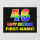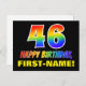 La façade de cette carte postale joyeuse, colorée et amusante à thème d'anniversaire comporte un grand numéro "46" et le message "HAPPY BANTHDAY", tous deux dotés d'une couleur motif inspirée par un gradient de spectre arc-en-ciel, ainsi qu'un nom de destinataire personnalisé jaune gras. L'avant est également orné d'un arrière - plan de couleur noire. Le dos de la carte postale contient un message d'anniversaire personnalisé, ou peut-être peut-être effacé et laissé vide si un message doit être écrit à la main à la place. Une carte postale d’anniversaire personnalisée comme celle-ci pourrait être une façon amusante de souligner le quarante-sixième anniversaire de quelqu’un. [~Z0000474]
