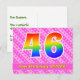 L'avant de cette carte postale de joyeux anniversaire joyeuse, gaie et affectueuse présente un grand nombre "46" avec un motif dégradé de spectre d'arc-en-ciel. Elle comporte également le message "Joyeux 46e anniversaire" et un nom de destinataire personnalisable. L'avant présente en outre des cœurs en rose clair et rose foncé et un motif de rayures joyeux. Le dos comporte un message de vœux d'anniversaire modifiable, ou pourrait éventuellement être effacé et laissé vierge si un message doit être écrit à la main à la place. Une carte postale d'anniversaire personnalisable comme celle-ci pourrait être un moyen amusant d'envoyer un message pour célébrer le quarante-sixième anniversaire de quelqu'un. Des cartes postales comme celle-ci pourraient également être utilisées pour inviter des invités à une fête d'anniversaire