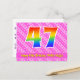 L'avant de cette carte de vœux d'anniversaire au design joyeux, heureux et enjoué présente un grand nombre "47" avec un motif dégradé de spectre d'arc-en-ciel, ainsi que le message "Joyeux 47e anniversaire" et le nom personnalisé du destinataire. L'avant présente également un motif rayé rose clair et rose foncé avec des formes de cœur. Le verso comporte un message de vœux d'anniversaire personnalisé, ou pourrait éventuellement être effacé et laissé vide si un message doit être écrit à la main à la place. Une carte de vœux d'anniversaire personnalisable comme celle-ci pourrait être un moyen amusant de célébrer le quarante-septième anniversaire de quelqu'un. Des cartes postales comme celle-ci pourraient également être utilisées pour inviter des invités à une fête d'anniversaire organisée pour quelqu'un qui va avoir