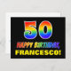 La façade de cette carte postale amusante, joyeuse et colorée à thème d'anniversaire comporte un grand nombre de "50" et le message "HAPPY BANTHDAY", tous deux avec un dégradé de arc-en-ciel inspiré couleur motif, avec un nom de destinataire personnalisé jaune gras. L'avant est également orné d'un arrière - plan simple et noir. Le dos de la carte postale a un message de voeux d'anniversaire personnalisé, ou peut-être peut-être être effacé et laissé vide si un message doit être écrit à la main à la place. Une carte postale d’anniversaire personnalisable et dynamique comme celle-ci pourrait être une façon amusante d’envoyer un message célébrant le cinquantième anniversaire de quelqu’un. [~Z0000474]