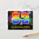 Le devant de cette carte d'anniversaire excitante, amusante et colorée présente un grand nombre "52" avec un motif inspiré d'un dégradé de spectre d'arc-en-ciel. Il comporte également le message "Joyeux 52e anniversaire" et un nom de destinataire modifiable. Le devant comporte en outre un motif de fond coloré et vibrant de feux d'artifice célébrant l'explosion. Le dos comporte un message de vœu d'anniversaire personnalisé, ou pourrait éventuellement être effacé et laissé vide si un message doit être écrit à la main à la place. Une carte d'anniversaire personnalisée comme celle-ci pourrait être un moyen amusant de reconnaître l'anniversaire de quelqu'un de cinquante-deux ans. Des cartes comme celle-ci pourraient également être utilisées pour inviter des invités à une célébration d'anniversaire ou une fête organisée pour quelqu'un qui a