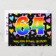 Le recto de cette carte d'anniversaire amusante, affectueuse et colorée présente un grand nombre "64" avec un motif dégradé de spectre arc-en-ciel. Il comporte également le message "Joyeux 64e anniversaire" et un nom de destinataire personnalisable. Le recto présente en outre un motif de fond de formes de cœur affectueuses coloré et vibrant. Le verso comporte un message de vœu d'anniversaire personnalisable, ou pourrait éventuellement être effacé et laissé vide si un message doit être écrit à la main à la place. Une carte d'anniversaire personnalisée comme celle-ci pourrait être un moyen amusant de célébrer le soixante-quatrième anniversaire de quelqu'un. Des cartes postales comme celle-ci pourraient également être utilisées pour inviter des invités à une fête d'anniversaire ou une célébration organisée pour quelqu'un qui a 64 ans.