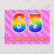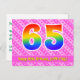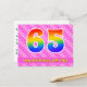 La face avant de cette conception de carte postale d'anniversaire joyeuse, aimante et amusante présente un grand nombre "65" avec un motif inspiré d'un dégradé de spectre d'arc-en-ciel, ainsi que le message "Joyeux 65e anniversaire" et un nom de destinataire personnalisé. L'avant présente également un motif joyeux de cœurs et de rayures rose foncé et rose clair. Le verso comporte un message de vœux d'anniversaire personnalisable, ou pourrait éventuellement être effacé et laissé vide si un message doit être écrit à la main à la place. Une carte postale d'anniversaire personnalisable comme celle-ci pourrait être un moyen amusant d'envoyer un message pour célébrer le soixante-cinquième anniversaire de quelqu'un. Des cartes postales comme celle-ci pourraient également être utilisées pour inviter des invités à une fête d'annivers