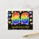 L'avant de cette conception de carte postale colorée, excitante et affectueuse à thème d'anniversaire présente un grand nombre "66" avec un motif dégradé de spectre d'arc-en-ciel, ainsi que le message "Joyeux 66e Anniversaire," et un nom de destinataire modifiable. L'avant présente en outre un motif de fond de formes de cœur affectueuses coloré et vibrant. Le dos présente un message de vœu d'anniversaire personnalisé, ou pourrait éventuellement être effacé et laissé vide si un message doit être écrit à la main à la place. Une carte postale d'anniversaire personnalisable comme celle-ci pourrait être un moyen amusant de célébrer le soixante-sixième anniversaire de quelqu'un. Des cartes postales comme celle-ci pourraient également être utilisées pour inviter des invités à une fête d'anniversaire organisée pour quelqu'un qui a 66 ans