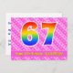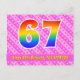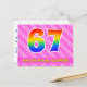Le recto de cette conception de carte postale d'anniversaire joyeuse, aimante et heureuse présente un grand nombre "67" ayant un motif dégradé de spectre d'arc-en-ciel. Il comporte également le message "Joyeux 67e anniversaire" et un nom de destinataire personnalisable. Le recto comporte en outre un motif joyeux de formes de cœur et de rayures roses foncés et roses clairs. Le verso comporte un message de vœu d'anniversaire personnalisé, ou pourrait éventuellement être effacé et laissé vide si un message doit être écrit à la main à la place. Une carte postale d'anniversaire comme celle-ci pourrait être un moyen amusant d'envoyer des vœux d'anniversaire à quelqu'un qui célèbre son soixante-septième anniversaire. Des cartes postales comme celle-ci pourraient également être utilisées pour inviter des invités à une fête d'ann
