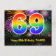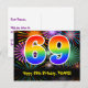 L'avant de cette conception de carte postale thématique d'anniversaire amusante, colorée et excitante présente un grand nombre "69" avec un motif inspiré d'un dégradé de spectre arc-en-ciel. Elle comporte également le message "Joyeux 69e anniversaire," et un nom de destinataire personnalisé. L'avant présente en outre un motif de fond vibrant et coloré inspiré de l'apparence de feux d'artifice de célébration qui éclatent. Le verso comporte un message de vœux d'anniversaire personnalisé, ou pourrait éventuellement être effacé et laissé vierge si un message doit être écrit à la main à la place. Une carte postale d'anniversaire personnalisée comme celle-ci pourrait être un moyen amusant d'envoyer un message pour célébrer le soixante-neuvième anniversaire de quelqu'un. Des cartes postales comme celle-ci pourraient également être utilisées pour inv