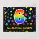 L'avant de cette carte postale d'anniversaire amusante, excitante et colorée présente un grand nombre "6" avec un motif inspiré d'un dégradé de spectre d'arc-en-ciel. Elle comporte également le message "Joyeux 6ème anniversaire" et un nom de destinataire personnalisable. L'avant présente en outre un motif de fond d'étoiles colorées et vibrantes. Le verso comporte un message de vœux d'anniversaire modifiable, ou pourrait éventuellement être effacé et laissé vide si un message doit être écrit à la main à la place. Une carte postale d'anniversaire personnalisée comme celle-ci pourrait être un moyen amusant de célébrer le sixième anniversaire de quelqu'un. Des cartes postales comme celle-ci pourraient également être utilisées pour inviter des invités à une fête d'anniversaire organisée pour quelqu'un qui va avoir 6 ans.