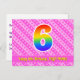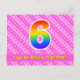 Le recto de cette carte postale d'anniversaire joyeuse, dynamique et amusante présente un grand chiffre "6" avec un motif dégradé de spectre arc-en-ciel, ainsi que le message "Joyeux 6ème anniversaire" et un nom de destinataire personnalisable. Le recto comporte également un motif joyeux composé de cœurs et de rayures roses clair et foncé. Le verso présente un message de vœux d'anniversaire modifiable, ou pourrait éventuellement être effacé et laissé vierge si un message doit être écrit à la main à la place. Une carte postale d'anniversaire personnalisée comme celle-ci pourrait être un moyen amusant d'envoyer un message pour célébrer le sixième anniversaire de quelqu'un. Des cartes postales comme celle-ci pourraient également être utilisées pour inviter des invités à une célébration d'anniversaire ou à une fête organisée pour quelqu'un