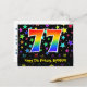 Le devant de cette conception de carte postale thématique d'anniversaire colorée, excitante et amusante présente un grand nombre "77" ayant un motif dégradé de spectre d'arc-en-ciel. Il comporte également le message "Joyeux 77e Anniversaire" et un nom de destinataire personnalisé. Le devant comporte en outre un motif de fond en forme d'étoile coloré et vibrant. Le verso comporte un message de vœu d'anniversaire personnalisé, ou pourrait éventuellement être effacé et laissé vide si un message doit être écrit à la main à la place. Une carte postale d'anniversaire personnalisée comme celle-ci pourrait être un moyen amusant de reconnaître l'anniversaire de quelqu'un de soixante-dix-sept ans. Des cartes postales comme celle-ci pourraient également être utilisées pour inviter des invités à une célébration d'anniversaire ou une fête organisée pour quelqu'un qui