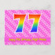 Le recto de cette carte d'anniversaire joyeuse, dynamique et affectueuse présente un grand nombre "77" avec un motif à dégradé de spectre arc-en-ciel. Il comporte également le message "Joyeux 77e Anniversaire" et un nom de destinataire modifiable. Le recto présente en outre un motif joyeux de cœurs et de rayures rose foncé et rose clair. Le verso comporte un message de vœux d'anniversaire modifiable, ou pourrait éventuellement être effacé et laissé vierge si un message doit être écrit à la main à la place. Une carte d'anniversaire personnalisée comme celle-ci pourrait être un moyen amusant de célébrer le soixante-dix-septième anniversaire de quelqu'un. Des cartes comme celle-ci pourraient également être utilisées pour inviter des invités à une fête ou une célébration d'anniversaire organisée pour quelqu'un qui a 77 ans