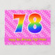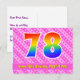 Le recto de cette carte postale d'anniversaire joyeuse, dynamique et amusante présente un grand nombre "78" avec un motif inspiré d'un dégradé de spectre d'arc-en-ciel, ainsi que le message "Joyeux 78e Anniversaire," et un nom de destinataire personnalisable. Le recto présente également un motif rayé rose clair et rose foncé joyeux contenant des formes de cœur. Le verso comporte un message de vœux d'anniversaire personnalisé, ou pourrait éventuellement être effacé et laissé vide si un message doit être écrit à la main à la place. Une carte postale d'anniversaire personnalisable comme celle-ci pourrait être un moyen amusant d'envoyer un message pour célébrer le soixante-dix-huitième anniversaire de quelqu'un. Des cartes postales comme celle-ci pourraient également être utilisées pour inviter des invités à une fête d'anniversaire