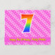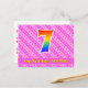 Le recto de cette carte d'anniversaire joyeuse, heureuse et amusante présente un grand chiffre "7" avec un motif dégradé de spectre arc-en-ciel. Il comporte également le message "Joyeux 7ème anniversaire" et un nom de destinataire personnalisé. Le recto présente en outre un motif rayé rose clair et rose foncé joyeux avec des formes de cœur. Le verso comporte un message de vœux d'anniversaire personnalisé, ou pourrait éventuellement être laissé vierge si un message doit être écrit à la main à la place. Une carte d'anniversaire personnalisable comme celle-ci pourrait être un moyen amusant d'envoyer un message pour célébrer le septième anniversaire de quelqu'un. Des cartes comme celle-ci pourraient également être utilisées pour inviter des invités à une célébration d'anniversaire ou à une fête organisée pour quelqu'un qui va avoir 7 ans.