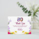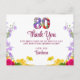 80e anniversaire floral merci moderne 80 ans de fête Carte postale. Montrez votre gratitude dans le style avec cet élégant carte de remerciements de 50e anniversaire avec des accents floraux vibrants et un message sincère. L'avant de la carte affiche un grand "80" dans un design floral coloré et les mots "Merci" dans un script en gras, suivi d'un message personnalisable. Le côté arrière présente une note d'appréciation touchante pour célébrer un jalon de 80 merveilleuses années remplies d'amour, de rire et de souvenirs. Cette carte est le moyen parfait pour express vos remerciements pour avoir assisté à votre journée spéciale et pour tous les cadeaux généreux reçus. Personnalisez facilement cette carte de remerciements pour refléter vos propres sentiments uniques. Bon appétit !