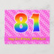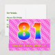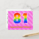 Le recto de cette carte d'anniversaire joyeuse, dynamique et amusante présente un grand nombre "81" avec un motif dégradé de spectre d'arc-en-ciel, ainsi que le message "Joyeux 81e anniversaire" et un nom de destinataire modifiable. Le recto présente également un motif rayé rose clair et rose foncé joyeux avec des formes de cœur. Le verso présente un message de vœux d'anniversaire personnalisé, ou pourrait éventuellement être effacé et laissé vierge si un message doit être écrit à la main à la place. Une carte d'anniversaire personnalisable comme celle-ci pourrait être un moyen amusant de souhaiter un joyeux anniversaire à quelqu'un qui fête son quatre-vingt-unième anniversaire. Des cartes comme celle-ci pourraient également être utilisées pour inviter des invités à une fête ou à une célébration organisée pour quelqu'un