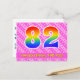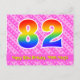 Le recto de cette carte de vœux d'anniversaire joyeuse, amusante et dynamique présente un grand nombre « 82 » avec un motif dégradé de spectre d'arc-en-ciel, ainsi que le message « Joyeux 82e anniversaire » et un nom de destinataire modifiable. Le recto comporte en outre un motif rayé rose foncé et rose clair joyeux contenant des formes de cœur. Le verso comporte un message de vœux d'anniversaire personnalisé, ou pourrait éventuellement être effacé et laissé vierge si un message doit être écrit à la main à la place. Une carte de vœux d'anniversaire personnalisable comme celle-ci pourrait être un moyen amusant de reconnaître les 82 ans de quelqu'un. Des cartes comme celle-ci pourraient également être utilisées pour inviter des invités à une fête d'anniversaire organisée pour quelqu'un qui a 82 ans.