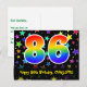 L'avant de cette conception de carte postale thématique d'anniversaire colorée, excitante et amusante présente un grand nombre "86" avec un motif inspiré d'un dégradé de spectre d'arc-en-ciel, ainsi que le message "Joyeux 86e anniversaire" et un nom de destinataire personnalisé. L'avant présente également un motif de fond en forme d'étoiles coloré et vibrant. Le verso comporte un message de vœux d'anniversaire personnalisé, ou pourrait éventuellement être effacé et laissé vide si un message doit être écrit à la main à la place. Une carte postale d'anniversaire personnalisable comme celle-ci pourrait être un moyen amusant de reconnaître le quatre-vingt-sixième anniversaire de quelqu'un. Des cartes postales comme celle-ci pourraient également être utilisées pour inviter des invités à une célébration d'anniversaire ou une fête organisée pour