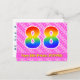 L'avant de cette carte de vœux d'anniversaire au design animé, joyeux et amusant comporte un grand nombre "88" avec un motif dégradé de spectre arc-en-ciel. Il comporte également le message "Joyeux 88e Anniversaire," et un nom de destinataire modifiable. L'avant comporte en outre un motif rayé rose clair et rose foncé joyeux avec des formes de cœur. Le verso comporte un message de vœux d'anniversaire personnalisable, ou pourrait éventuellement être effacé et laissé vierge si un message doit être écrit à la main à la place. Une carte de vœux d'anniversaire personnalisable comme celle-ci pourrait être un moyen amusant d'envoyer un message pour célébrer le quatre-vingt-huitième anniversaire de quelqu'un. Des cartes postales comme celle-ci pourraient également être utilisées pour inviter des invités à une