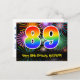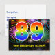 L'avant de cette carte postale à thème d'anniversaire passionnante, amusante et colorée présente un grand nombre "89" avec un motif inspiré d'un dégradé de spectre d'arc-en-ciel, ainsi que le message "Joyeux 89e Anniversaire," et un nom de destinataire modifiable. L'avant comporte en outre un motif de fond coloré et vibrant inspiré de l'apparence de feux d'artifice de célébration éclatants. Le dos comporte un message de vœu d'anniversaire personnalisé, ou pourrait éventuellement être effacé et laissé vierge si un message doit être écrit à la main à la place. Une carte postale d'anniversaire comme celle-ci pourrait être un moyen amusant d'envoyer des vœux d'anniversaire à quelqu'un qui célèbre son quatre-vingt-neuvième anniversaire. Des cartes postales comme celle-ci