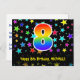 L'avant de cette carte d'anniversaire amusante, colorée et excitante présente un grand chiffre "8" avec un motif inspiré d'un dégradé de spectre arc-en-ciel. Elle comporte également le message "Joyeux 8ème anniversaire" et un nom de destinataire modifiable. L'avant présente en outre un motif de fond d'étoiles vibrant et coloré. Le verso comporte un message de vœux d'anniversaire modifiable, ou pourrait éventuellement être effacé et laissé vide si un message doit être écrit à la main à la place. Une carte d'anniversaire personnalisable comme celle-ci pourrait être un moyen amusant de célébrer le huitième anniversaire de quelqu'un. Des cartes postales comme celle-ci pourraient également être utilisées pour inviter des invités à une fête d'anniversaire ou une célébration organisée pour quelqu'un qui a 8 ans.