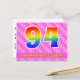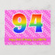 Le recto de cette carte de vœux d'anniversaire joyeuse, gaie et optimiste présente un grand nombre « 94 » avec un motif dégradé de spectre d'arc-en-ciel, ainsi que le message « Joyeux 94e anniversaire » et un nom de destinataire personnalisé. Le recto présente également un motif de cœurs et de rayures rose clair et rose foncé joyeux. Le verso comporte un message de vœux d'anniversaire modifiable, ou pourrait éventuellement être effacé et laissé vide si un message doit être écrit à la main à la place. Une carte de vœux d'anniversaire personnalisée comme celle-ci pourrait être un moyen amusant de reconnaître le quatre-vingt-quatorzième anniversaire de quelqu'un. Des cartes postales comme celle-ci pourraient également être utilisées pour inviter des invités à une fête d'anniversaire organisée pour quelqu