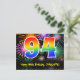 L'avant de cette conception de carte postale thématique d'anniversaire amusante, excitante et colorée présente un grand nombre "94" ayant un motif inspiré d'un dégradé de spectre d'arc-en-ciel. Il comporte également le message "Joyeux 94e anniversaire" et un nom de destinataire personnalisé. L'avant présente en outre un motif de fond vibrant et coloré inspiré de feux d'artifice de célébration qui éclatent. Le verso comporte un message de vœux d'anniversaire personnalisé, ou pourrait éventuellement être effacé et laissé vide si un message doit être écrit à la main à la place. Une carte postale d'anniversaire personnalisée comme celle-ci pourrait être un moyen amusant d'envoyer un message pour célébrer le quatre-vingt-quatorzième anniversaire de quelqu'un. Des cartes postales comme celle-ci pourraient également être utilisées pour