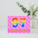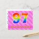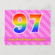 Le recto de cette carte d'anniversaire amusante, joyeuse et affectueuse présente un grand nombre "97" avec un motif dégradé de spectre arc-en-ciel. Il comporte également le message "Joyeux 97e anniversaire" et un nom de destinataire personnalisable. Le recto comporte en outre un motif rayé rose foncé et rose clair joyeux contenant des formes de cœur. Le verso comporte un message de vœux d'anniversaire personnalisé, ou pourrait éventuellement être laissé vide si un message doit être écrit à la main à la place. Une carte d'anniversaire personnalisée comme celle-ci pourrait être un moyen amusant de reconnaître l'anniversaire de quelqu'un de quatre-vingt-dix-sept ans. Des cartes postales comme celle-ci pourraient également être utilisées pour inviter des invités à une fête d'anniversaire organisée pour quelqu'un qui a 97 ans.