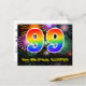 L'avant de cette conception de carte postale thématique d'anniversaire amusante, excitante et colorée présente un grand nombre "99" avec un motif inspiré d'un dégradé de spectre d'arc-en-ciel, ainsi que le message "Joyeux 99e Anniversaire" et un nom de destinataire personnalisé. L'avant présente également un motif de fond coloré et vibrant de feux d'artifice célébrant l'explosion. Le verso comporte un message de vœux d'anniversaire personnalisé, ou pourrait éventuellement être effacé et laissé vide si un message doit être écrit à la main à la place. Une carte postale d'anniversaire personnalisable comme celle-ci pourrait être un moyen amusant d'envoyer un message pour célébrer le quatre-vingt-dix-neuvième anniversaire de quelqu'un. Des cartes postales comme celle-ci pourraient également être utilisées pour inviter des inv