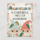 A friendly and vibrant digital greeting card featuring two garden gnomes and colorful parrots. The top of the illustration displays multilingual greetings "HOLA! HELLO! HI!" in bold, playful lettering, followed by the phrase "A CHEERFUL HELLO!". The scene is framed by a floral border of pink roses and green leaves, creating a warm and welcoming design. Customize it with the name of your choice.