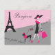 Gris rose et noir. Tour Eiffel en arrière - plan. Femme habillée à la mode marchant son chien et portant des sacs de courses. "Bonjour" et "Oh La" ci-dessus.