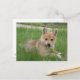 Carte postale avec un adorable chiot à l'avant, manger des tiges de pandelion à l'extérieur.