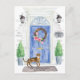 Annoncez votre nouvelle adresse avec notre faire-part élégante avec un chat Abyssinien, une porte d'entrée bleue, un tapis de bienvenue, une ardoise, des topiaires et une couronne fleurie posée sur un arrière - plan en brique grise.