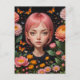 Carte Postale Adorable fille avec cheveux roses dans les fleurs