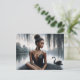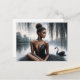 Cette carte postale à thème de ballet présente des oeuvres d'une ballerine à la peau foncée, assise devant un lac, sous un saule. Un cygne noir nage sur le plan d'eau derrière elle. Le tableau a une atmosphère humoristique avec son jeu de couleurs en niveaux de gris, à l'exception de la pop de peau brune riche sur l'élégante danseuse de ballet poisée. Elle regarde du côté comme elle pose pour ce portrait de la nature sombre. Idéal pour les amateurs de balletcore noir et d'esthétique de ballet riche en mélanine.