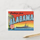 This striking retro-style design captures the history and charm of the Heart of Dixie. It features the bold "Greetings from Alabama" typography set against a scenic backdrop showcasing a naval warship (referencing the iconic USS Alabama Battleship Memorial Park in Mobile) and a classical neoclassical monument. A beautiful pink flower, often representing the Southern landscape, completes the vintage aesthetic. Perfect for fans of classic travel posters, retro artwork, military history, and the rich culture of this US Southern State.