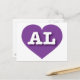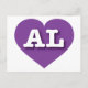 Cette carte postale est dotée d'un coeur violet plein de vitalité, contenant les lettres coques en haut, blanches et audacieuses AL, l'abréviation officielle de l'Alabama, l'état jaune. Le verso de la carte postale est vide, en attendant vos sentiments manuscrits ou le texte customisé.