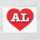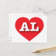Cette carte postale est dotée d'un coeur rouge vif contenant des lettres coques supérieures blanches en gras AL, l'abréviation officielle de Alabama, l'état jaune. Le verso de la carte postale est vide, en attendant votre texte customisé ou vos sentiments manuscrits. Marche !