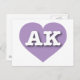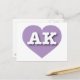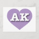 Cette carte postale présente un coeur de lavande moelleuse contenant les lettres coques supérieures blanches en gras AK, l'abréviation officielle pour Alaska, la dernière frontière. Le verso de la carte postale est vide, en attendant vos sentiments manuscrits ou le texte customisé.