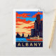 Carte postale Albany. Bateau à moteur sur la rivière Hudson et gratte-ciel derrière. Carte postale de voyage aux couleurs vives.