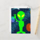 Un alien faisant le signe de paix avec sa main. En espace, l avec des planètes, et étoiles derrière lui. Une des planètes est la terre.