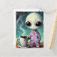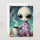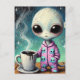 Un drôle d'Alien habillé en pjs avec un café extra sombre du matin
