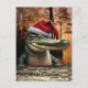 Cet alligator vert dans un marécage a un chapeau de Père Noël et vous souhaite des vacances heureuses.