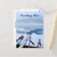 Belle photographie des Alpes montrant des skis au premier plan, avec beaucoup de neige. Customisez avec votre propre salutation et texte, et n'oubliez pas les timbres correspondants aussi.