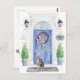 Annoncez votre nouvelle adresse avec notre faire-part élégante avec un American Shorthair cat, une porte d'entrée bleue, un tapis de bienvenue, une ardoise, des topiaires et une couronne fleurie posée sur un arrière - plan en brique grise.