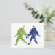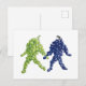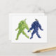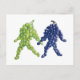Carte postale Grape Friends. Une paire de grappes de raisin, une verte et une violette, marchent main dans la main. La tige du bouquet vert semble regarder le bouquet pourpre. La tige de raisin mauve retourne avec impatience le regard. Cette illustration crée une scène fantaisiste avec les caractéristiques humaines de l'amitié, de l'amour, de la gentillesse et de la tolérance alors que leurs pas rebondissants les transportent ensemble.