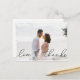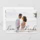 Une photo moderne et élégante grâce carte postale conçue pour accommoder votre photo mariage horizontale ou paysagère préférée avec "amour et merci" comme une incrustation de texte de script noir doux. Personnalisez avec vos noms et/ou la date mariage en dessous. Les cartes postales sont inversées pour montrer votre adresse de retour avec suffisamment d'espace pour l'adressage du destinataire, ainsi qu'un message pré-imprimé et une photo supplémentaire en option. Si vous préférez ajouter un message manuscrit, supprimez simplement l'exemple de texte affiché.