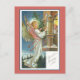 OEuvre vintage d'un ange blond portant un petit arbre à feuillage persistant et frappant à la fenêtre d'une petite fille