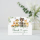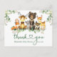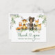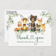 Écriture calligraphique moderne Cœur, Carte de remerciement de douche pour bébé Animaux de la forêt à l'aquarelle. Les bébés animaux comprennent Ours, Cerf, Élan, Raton laveur, Lapin, Renard et Hibou sur feuilles d'eucalyptus et verdure forestière.